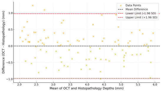 Bland–Altman plot of the agreement on tumour depth. This plot evaluates the agreement between OCT and histopathological measurements, showing the mean differences and 95% limits of agreement.
