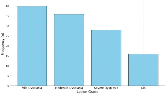 Stacked bar chart of the lesion grade distribution. This chart illustrates the frequency of lesions across histopathological grades (mild, moderate, severe dysplasia, and CIS), providing a clear visual distribution.