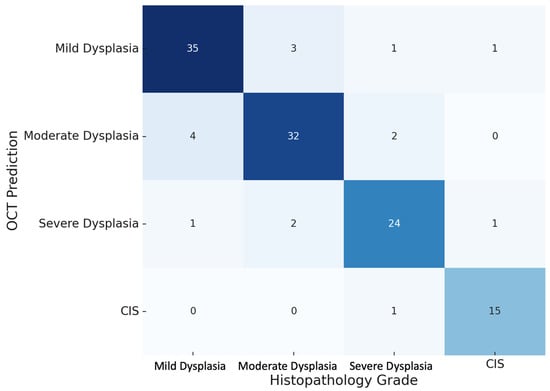 Margin predictions of OCT against dysplasia grades were further highlighted in the heat map presented in Figure 8. The figure strongly underlined a very sharp diagonal correlation between the OCT and histopathology predictions, hence indicating very strong agreements. Misclassifications were few and usually between adjacent grades of dysplasia. The diagonals that were underlined showed the high precision of OCT against the matching histopathological diagnosis, while the few prediction errors were spotted as off-diagonal data.