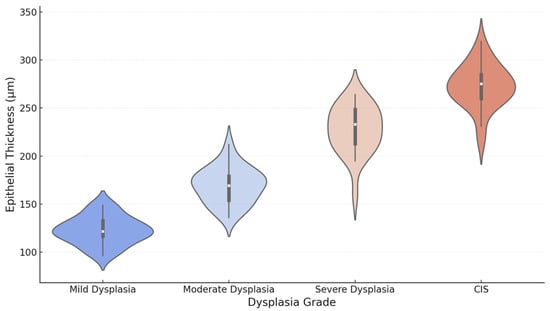 Violin plot of the epithelial thickness of each dysplasia grade. This violin plot shows the distribution of epithelial thickness across dysplasia grades, highlighting the trends and variability.