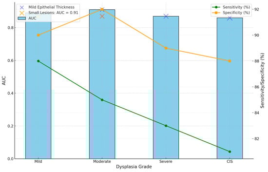 The overall diagnostic performance of OCT is summarized in the multi-dimensional visualization presented in Figure 10. This figure integrates the AUC values, sensitivity, specificity, epithelial thickness, and lesion characteristics into a cohesive representation that underlines the strong capabilities of OCT across diverse lesion profiles. The layered display of diagnostic metrics is unified in a view enabling clinicians to appreciate the role of OCT in tackling complex diagnostic challenges effectively.