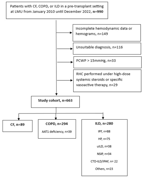 During the study period, we reviewed 990 patients diagnosed with CF, COPD, or ILD as part of the lung transplantation evaluation process at our center. After applying the exclusion criteria, 327 patients were excluded: 149 due to incomplete data (n = 60 for incomplete hemodynamic data and n = 89 for incomplete hemograms), 116 due to an unsuitable diagnosis, 33 due to postcapillary PH, and 29 due to high-dose systemic steroids or specific vasoactive therapy. This left a final cohort of 663 patients: 89 patients with CF, 294 patients with COPD, and 280 patients with ILD. A detailed overview of the study cohort is shown in Figure 1.