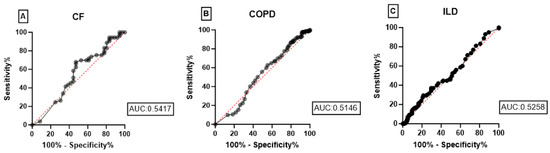 ROC curves of (A) CF, (B) COPD and (C) ILD.