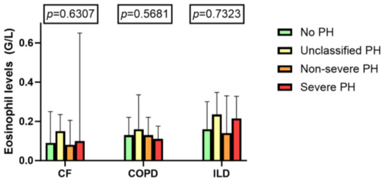 Our analysis revealed no significant differences in current blood eosinophil levels among the various PH groups (CF: p = 0.63; COPD: p = 0.57; ILD: p = 0.73), Figure 3. However, ILD exhibited the highest eosinophil levels among the groups of PH.