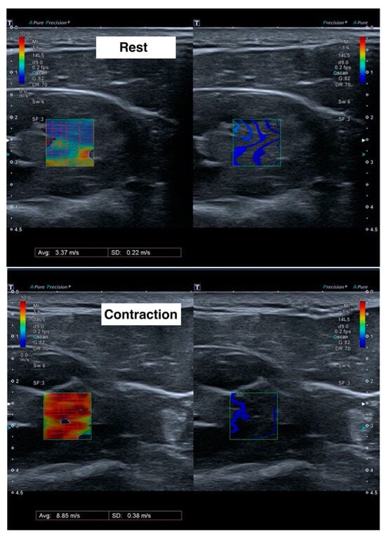 Ultrasound images during shear wave elastography measurements at rest (upper) and during contraction (lower). Left images show the velocity of the shear waves in meters per second, with red color meaning more speed and blue color less speed. Right images show the form of the shear wave.