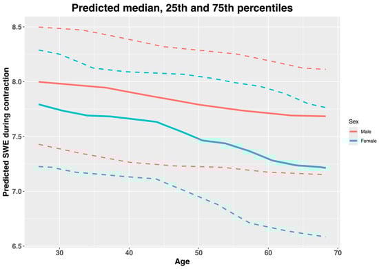Predicted normative values of median, 25th and 75th percentiles of shear wave elastography (SWE) of supraspinatus muscle during contraction, by age and sex. Solid lines are medians, and dashed lines are 25th and 75th percentiles. Data interpretation: There is an estimated decrease in SWE measurements during contraction with increasing age, and males show greater SWE values than females, which do not appear to be influenced by age.