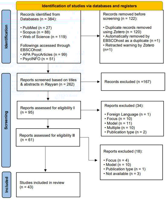 The search identified 384 studies. The study selection through an extensive data extraction process is displayed in Figure 1. First, several duplicate results (122) were removed using Zotero 6.0.27 [26]. Second, a three-step data screening took place with the collaboration of all authors, both using Rayyan [27] and manually on a screening sheet prepared by the second author. Finally, 43 studies were included in this systematic literature review, meeting all the eligibility criteria that we had established.