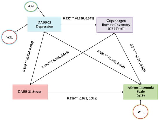 Notes: W.E., work experience (in years); Ind1: (1) DASS-21 Stress → DASS-21 Depression → AIS = DASS-21 Stress → DASS-21 Depression × DASS-21 Depression → AIS; Ind2: (2) DASS-21 Stress → CBI → AIS = DASS-21 Stress → CBI × CBI → AIS; Ind3: (3) DASS-21 Stress → DASS-21 Depression → CBI → AIS = DASS-21 Stress → DASS-21 Depression × DASS-21 Depression → CBI × CBI → AIS. * Total Indirect = Ind1 + Ind2 + Ind3, based on 5000 bootstrap samples.