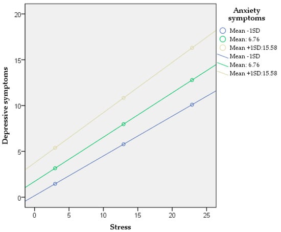 In both pathways, the index of moderated mediation was significant: b = 0.0009, 95% percentile CI [0.0001, 0.0019], and b = 0.0002, 95% percentile CI [0.0000, 0.0005], providing support for a moderated mediation. A change of 0.37% in depressive symptoms can be attributed to the interaction term. The results revealed a significantly positive moderating role of anxiety symptoms on the linkage between stress and depressive symptoms (b = 0.066, t = 2.3841, p = 0.0176), Table 5. This shows that at higher levels of anxiety symptoms, the impact of stress on depressive symptoms is reinforced.