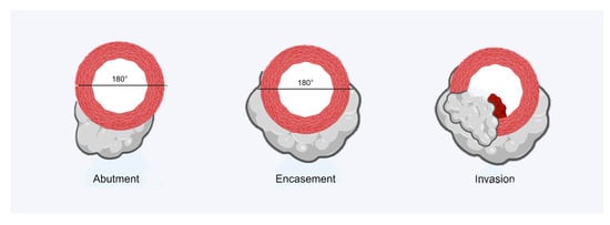 The degree of vascular involvement is defined by the anatomical relationship between tumor tissue and vessels, classifying the contact with the terms of abutment, encasement, and invasion [13] (Figure 1).