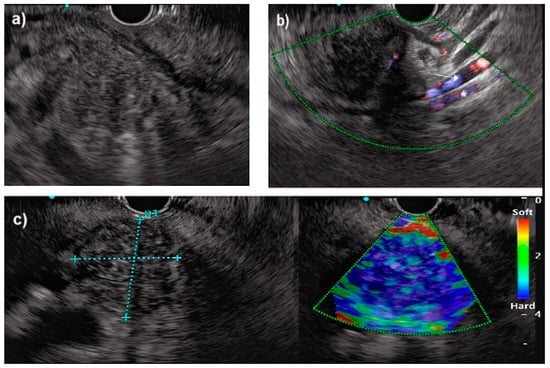 Pancreatic ductal adenocarcinoma appears at EUS as an inhomogeneous hypoechoic mass with irregular margins (Figure 3) [10]. Additional techniques allow a better characterization of the lesions such as the application of contrast-enhanced EUS for assessing the vascularization of the mass vascularization or the elastography for estimating the stiffness of the lesion [31,32]. The additional advantages of EUS over cross-sectional images are especially for small pancreatic masses (0.5–2 cm) [10]. For these reasons, EUS is used in association with cross-sectional images in high-risk patients (e.g., subjects with a family history or mutation carriers with/without a family history) as a screening tool to detect early lesions [33]. The main and established role of EUS for the evaluation of PDAC is the ability to perform TA with fine-needle aspiration (FNA) or fine-needle biopsy (FNB). EUS-TA is the current gold standard to obtain histological diagnosis of PDAC compared with percutaneous sampling that is associated with higher adverse events [34]. FNB is generally preferred for TA, but FNA when associated with rapid on-site evaluation (ROSE), has the same sensitivity of FNB for PDAC diagnosis [35]; however, FNA + ROSE is not diffused, it necessitates expert pathologists, and it is more expensive and time consuming [36]. Lastly, EUS-TA also allows an accurate characterization for molecular profiling [37].