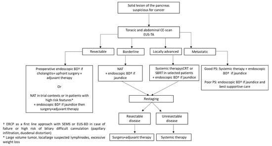 Borderline resectable tumors are a subgroup of PDAC difficulty in reaching a radical resection (R0). NAT is usually indicated in patients with borderline resectable PDAC. Some chemotherapeutic agents require the normalization of liver function and therefore BD is mandatory in order to avoid biliary complications during NAT (e.g., cholangitis) and to speed up the therapy’s starting.