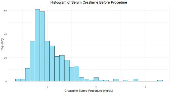 A key strength of our study is that it specifically focuses on CIN in patients undergoing peripheral endovascular procedures, where the amount of contrast media used is typically lower, and the patients tend to be more hemodynamically stable compared to those undergoing cardiac or neurovascular endovascular procedures. Additionally, none of the patients received repeated contrast administrations, which is another recognized risk factor for CIN [,,,]. This is because contrast-enhanced imaging, such as angio-CT, was performed prior to the intervention, and the endovascular procedures were scheduled electively, in a stable setting.