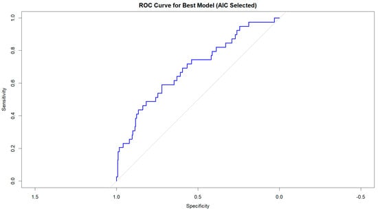 This model had the lowest AIC (232.4), indicating the best balance between explanatory power and simplicity. To assess the model’s discrimination ability, we generated a receiver operating characteristic (ROC) curve, calculating the area under the curve (AUC) as a measure of predictive performance. The model’s AUC was 0.69, suggesting good discrimination between patients who developed CIN and those who did not. Additionally, we assessed multicollinearity using variance inflation factors (VIFs), ensuring that no predictor exhibited substantial collinearity (VIF < 5 for all included variables), confirming the model’s stability. These results indicate that age, hemoglobin, sex, and heart failure were the most critical independent predictors of CIN in our cohort, while other variables did not significantly improve model performance (Figure 4).