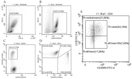 Gating strategy for lymphocytes subsets: all cells (A), CD45+ leucocytes (B), T lymphocytes CD45+CD3+ (C), Th CD45+CD3+ CD4+ (CD4+), and Tc CD45+CD3+ CD8+ (CD8+) lymphocytes (D). Then, Th cells were identified as Th effector memory re-expressing CD45RA (Th eff mem RA; CD62L–CD45RA+), Th-naïve (CD62L+CD45RA+), Th effector memory (CD62L−CD45RA; Th eff mem), and Th central memory (Th central mem; CD62L+CD45RA–) (E).