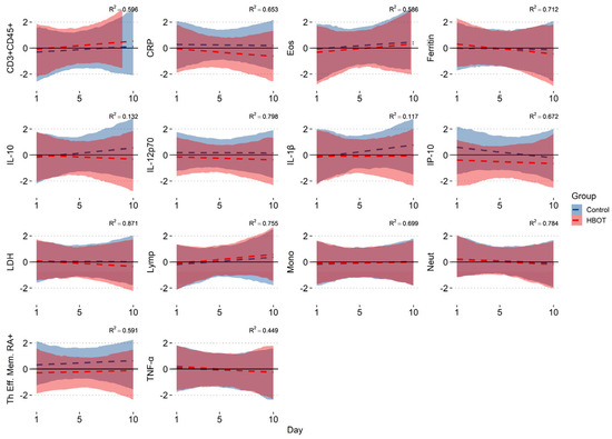 In the input measure, control and HBOT subjects did not differ significantly in the concentrations of the analyzed cytokines and leukocyte subpopulations (Mann–Whitney analysis: p > 0.05), except for IP-10 (p = 0.0018). Bayesian regression analysis showed consistent values with our previous publication, i.e., a decrease in the HBOT group in CRP −0.077 (95% CI: −0.122; −0.027), Ferritin −0.066 (95% CI: −0.107; −0.024), and LDH −0.047 (95% CI: −0.083; −0.014); an increase in both groups in Eos (HBOT: 0.073 [95% CI: 0.019; 0.125]; C: 0.068 [95% CI: 0.015; 0.121]) and Lymp (HBOT: 0.074 [95% CI: 0.026; 0.122]; C: 0.059 [95% CI: 0.012; 0.109]); a decrease in Neutr (HBOT: −0.046 [95% CI: −0.079; −0.015]; C: −0.034 [95% CI: −0.066; −0.003]); and an increase in the CD3+(% CD45+) lymphocyte population in the HBOT group of 0.071 (95% CI: 0.023; 0.122). In addition, the HBOT group showed a probability of a decrease over time in cytokine levels of TNF-α: 0.048 (95% CI: −0.098; −0.0002), IL-10: −0.085 (95% CI: −0.154; −0.017), and IP-10/CXCL10: −0.080 (95% CI: −0.129; −0.031); a decrease in IL-12p70: −0.026 (95% CI: −0.051;−0.0007); and in the control group, an increase in the percentage of RA+ Th effector cells: 0.047 (95% CI: 0.0006; 0.095), IL-1β: 0.094 (95% CI: 0.034; 0.158), and Mono 0.021 (95% CI: 0.003; 0.039) (Figure 2). In the remaining variables, the probabilities were not significant (95% CI exceeded 0), so there was no basis to conclude any probability of change over time in either group in IL-6, IFN-γ, IL-12p40, IL-1R, IL-23, IL-4, TARC, CD8+, Tc subpopulations, Th central memory, Th effector memory, Th naïve, or WBC.