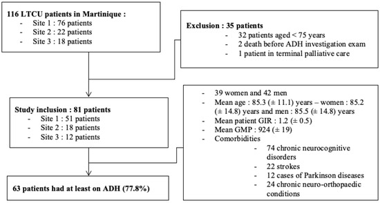 The present exploratory observational study involved the three LTCUs of the French Caribbean territory of Martinique; the LTCUs are affiliated with the sole University Hospital of the island. For study purposes, from 6 August to 29 September 2020, a review of the medical records of all institutionalized patients aged 75 years or older was conducted to identify existing deformations that corresponded to the ADH definition. Patient exclusion criteria were the existence of an episode of acute alteration of health status, uncontrolled chronic pain with an identified origin different from that of ADH, and the existence of an evolving neoplastic process in the palliative stage. To ensure the most reliable possible collection of cases of ADH, the healthcare teams were sensitized by the rehabilitation physician. Additionally, as in previous prevalence studies, patients with active pathologies or joint diseases were excluded to avoid overestimating the prevalence of deformities.