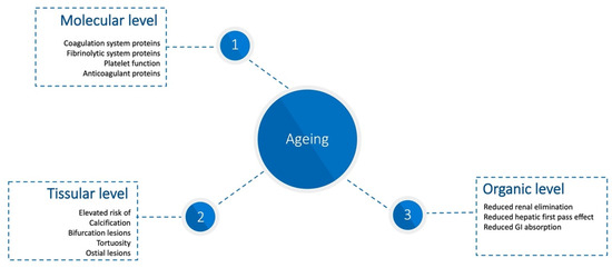 The hemostatic system relies on a delicate equilibrium, involving interactions between coagulation proteins, fibrinolytic proteins, platelets, and the vascular endothelium [7]. Aging disrupts this balance, increasing the risks of both bleeding and clotting (Figure 2).