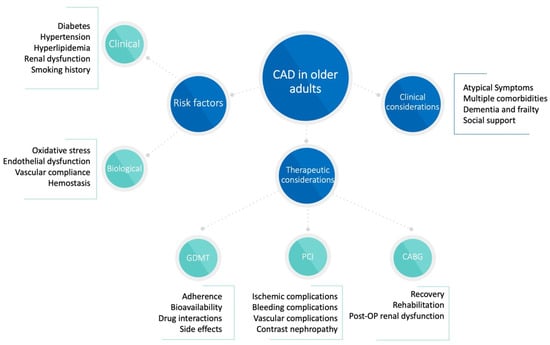 Assessing CAD in elderly patients requires consideration of their unique characteristics, which can be categorized into the following [22] (Figure 3):