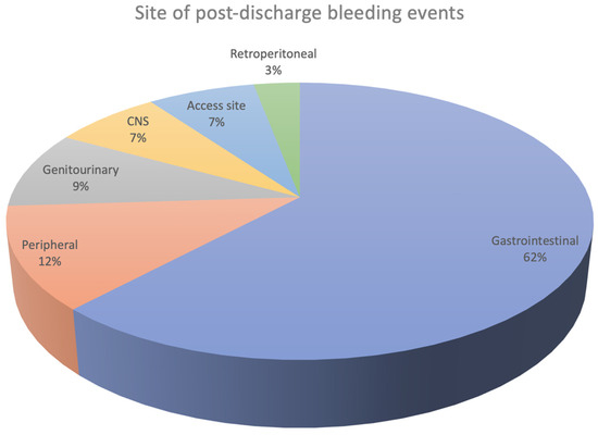 In the Assessment of Dual Anti-Platelet Therapy with Drug-Eluting Stents (ADAPT-DES) study, involving 8557 patients, 6.2% experienced bleeding events during long-term follow-up, with 15% of these patients reporting multiple events [35]. Among 444 patients with identified bleeding sources, the gastrointestinal tract emerged as the most common site of post-discharge hemorrhage (Figure 4). Importantly, hemorrhagic events during follow-up were strongly correlated with subsequent mortality, with adjusted hazard ratios even exceeding those for post-discharge myocardial infarction. This highlights the critical impact of bleeding complications on patient outcomes after PCI.