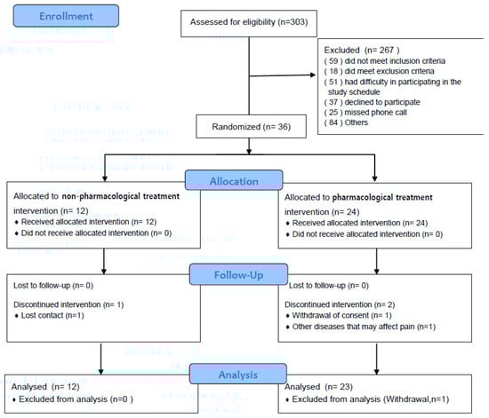 Between October 2021 and November 2022, 303 patients were screened at the four KM hospitals in South Korea. Of these, 36 patients who met the inclusion criteria and provided consent to participate in the study were enrolled and randomly assigned to non-PHM and PHM groups at a ratio of 1:2. One participant in the non-PHM group could not be contacted during the intervention period, one participant in the PHM group withdrew consent, and one participant discontinued the intervention because a disease that may affect the pain outcome in this study was identified during treatment. The ITT analysis was conducted on 35 participants (12 in the non-PHM group and 23 in the PHM group), excluding one participant who withdrew their consent (Figure 1).