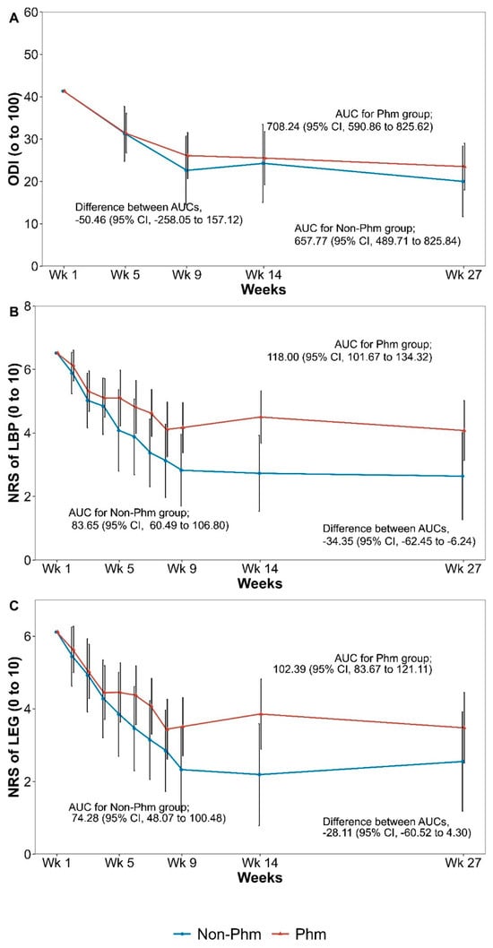 Area under the curves of each outcome by treatment group. (A) Oswestry disability index, (B) NRS of low back pain, (C) NRS for leg pain. AUC, area under the curve; PHM, pharmacological; Wk, week; ODI, Oswestry Disability Index; NRS, numeric rating scale; VAS, visual analog scale.