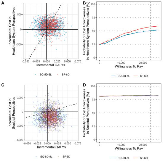 The results of the economic evaluation from the societal and healthcare system perspectives for the two groups are presented in Table 5. From a societal perspective, the non-PHM treatment strategy was confirmed to be the dominant option, with higher QALY values and lower total costs than the PHM treatment strategies. From the healthcare system perspective, which only included medical costs for cost calculation, the ICER calculated using the EQ-5D was USD 20,926, and the ICER calculated using the SF-6D was USD 15,260.