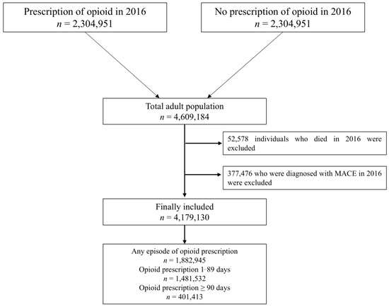 Initially, data for all adults (age ≥ 20 years) who obtained opioid prescriptions from medical facilities between 1 January 2016 and 31 December 2016, were requested. Data for each individual were collected for only 1 day of opioid medication. Consequently, this study included 2,304,592 individuals who received opioid prescriptions in 2016. Subsequently, a 1:1 stratified random sampling technique, taking age and sex into account, was used to request data for 2,304,592 adult non-users who did not obtain any opioid prescriptions between 1 January 2016 and 31 December 2016. Thus, the study included 4,609,184 adults. After 52,578 people who died in 2016 and 377,476 who were diagnosed with MACEs in 2016 were eliminated, 4,179,130 individuals were included in the analysis. In 2016, 1,882,945 individuals (45.1%) were prescribed opioids. The numbers of individuals who were administered opioids for 1–89 and 90 days were 1,481,532 (32.1%) and 401,413 (9.6%), respectively. Figure 1 shows the participant selection process used in this study.