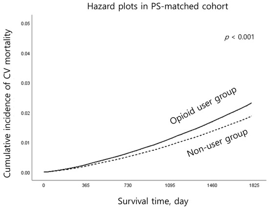 Additionally, we performed a sensitivity analysis using multivariable Cox regression modeling to examine whether the results obtained in the PS-matched cohort were similar to those of the entire cohort. All the covariates were included in the multivariable-adjusted model. The occurrence of MACEs or cardiovascular mortality was set as an event in the models, and the duration from 1 January 2017, to the date of the MACE diagnosis or cardiovascular death was considered the duration in the time-to-event analysis. Additional multivariable Cox regression models were employed to predict the occurrence of MACEs or cardiovascular mortality, with opioid users divided into two separate subgroups: those who had used opioids for 1–89 days and those who had used opioids for 90 days. The effects of the duration of opioid prescription on patient outcomes were also investigated. All results are reported as hazard ratios (HRs) with 95% confidence intervals (CIs), and log–log plots were used to confirm that the key assumptions of the Cox proportional hazard models were met. At a variance inflation factor of 2, no multicollinearity between the variables was explored using the multivariable model. SPSS for Windows (version 250; IBM Corp., Armonk, NY, USA) was used for all statistical analyses, and statistical significance was set at p < 0.05.