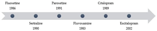 - Lopez-Munoz, F.; Alamo, C. Monoaminergic Neurotransmission: The History of the Discovery of Antidepressants from 1950s Until Today. Curr. Pharm. Des. 2009, 15, 1563–1586. [Google Scholar] [CrossRef]