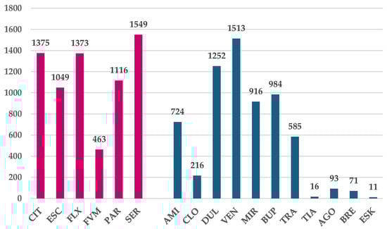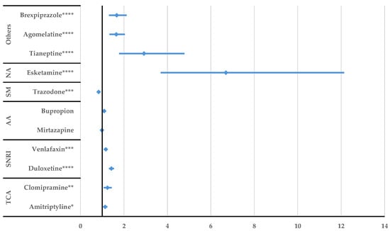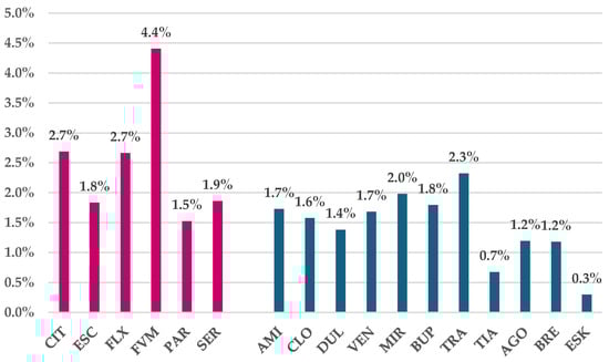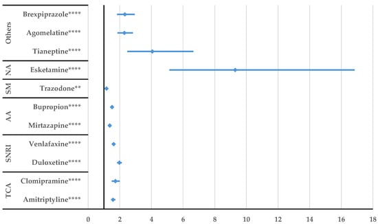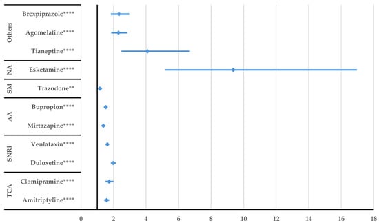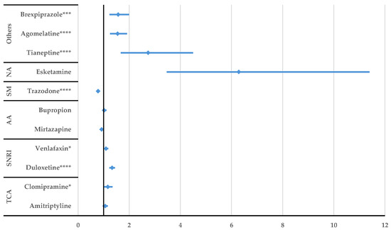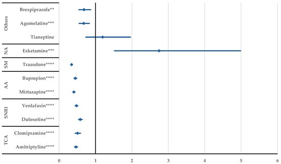 - “Psychiatric disorders”: higher frequency (esketamine–26.9%, tianeptine–17.8%, agomelatine–17.6%, brexpiprazole–17.5%, and trazodone 16.4%) and lower frequency (clomipramine–11.7%).