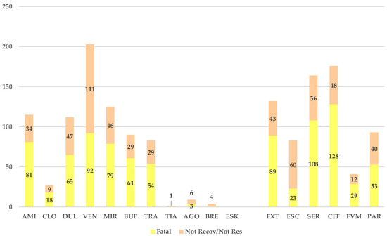 - Dobrea, C.M.; Frum, A.; Butuca, A.; Morgovan, C.; Stoicescu, L.; Chis, A.A.; Arseniu, A.M.; Rus, L.L.; Gligor, F.G.; Vonica-Tincu, A.L. Drug–Drug Interactions of Selective Serotonin Reuptake Inhibitors: A Pharmacovigilance Study on Real-World Evidence from the EudraVigilance Database. Pharmaceuticals 2024, 17, 1278. [Google Scholar] [CrossRef]