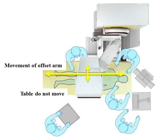 48]. Additionally, the movable range of the X-ray tube arm became wider, the blind area became smaller, and the lowering of the examination was enabled. However, previous X-ray fluoroscopic systems required us to move the fluoroscopy table to the left or right, or to lift and move the patient to align the fluoroscopy position with the target area, necessitating further improvements.