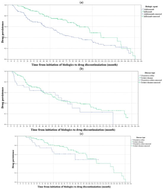 Kaplan–Meier survival analysis for evaluating drug persistence in patients with inflammatory bowel disease. (a) The blue line shows the drug persistence rates for the patients receiving adalimumab, and the green line shows the drug persistence rates for those receiving infliximab. The drug persistence rate was significantly higher in patients receiving infliximab than receiving adalimumab (p < 0.001). (b) The blue line shows the drug persistence rates of ulcerative colitis (UC) patients and the green line shows the drug persistence rates for Crohn’s disease (CD) patients receiving adalimumab. (c) The blue line shows the drug persistence rates for UC patients and the green line shows the drug persistence rates for CD patients receiving infliximab. There was no statistically significant difference in the drug persistence rate between UC and CD patients, nor between those receiving adalimumab or infliximab (p = 0.403 and p = 0.151, respectively).
