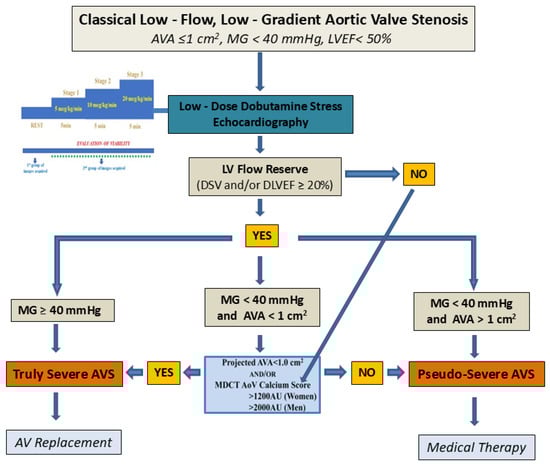 - Clavel, M.-A.; Ennezat, P.V.; Maréchaux, S.; Dumesnil, J.G.; Capoulade, R.; Hachicha, Z.; Mathieu, P.; Bellouin, A.; Bergeron, S.; Meimoun, P.; et al. Stress echocardiography to assess stenosis severity and predict outcome in patients with paradoxical low-flow, low-gradient aortic stenosis and preserved LVEF. JACC Cardiovasc. Imaging 2013, 6, 175–183. [Google Scholar] [CrossRef]