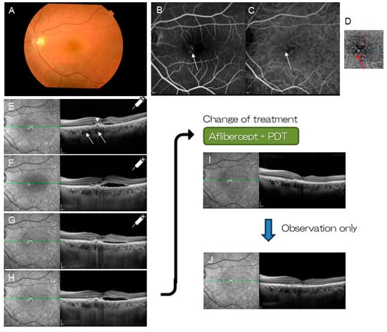 - Matsumiya, W.; Honda, S.; Otsuka, K.; Miki, A.; Nagai, T.; Imai, H.; Kusuhara, S.; Nakamura, M. One-year outcome of combination therapy with intravitreal aflibercept and verteporfin photodynamic therapy for polypoidal choroidal vasculopathy. Graefes Arch. Clin. Exp. Ophthalmol. 2017, 255, 541–548. [Google Scholar] [CrossRef] [PubMed]