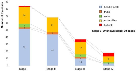 Clinical sites of cSCC at each stage. The sites of presentation were as follows: head and neck in 125 cases, trunk in 10 cases, vulva in 11 cases, extremities in 81 cases, and buttocks in 10 cases, respectively.
