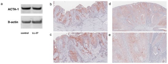 ACTA1 production in cSCC. ACTA1 production was detected by Western blotting (a). Immunohistochemical staining of ACTA1 in cSCC (b–e). Formalin-fixed, paraffin-embedded specimens were stained with anti-rabbit ACTA1 antibodies: cSCC developing from HS (b,c) and cSCC without HS (d,e).