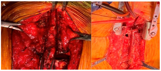 Intraoperative images of (A) Patient 1 and (B) Patient 2 highlight dense adhesions with two-stage sternotomy approach.