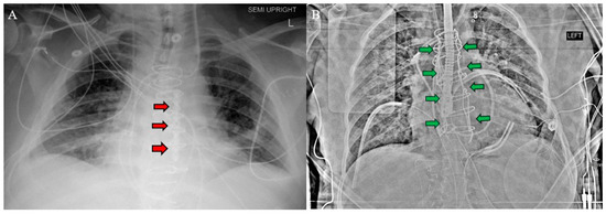 Postoperative chest X-ray for (A) Patient 1 and (B) Patient 2 demonstrate sternal plate used in Patient 1 (red arrows A) and Robicsek technique used in Patient 2 (green arrows B).