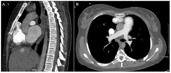 Patient 2 CT chest w/contrast. (A) Sagittal view and (B) axial view reveal extensive adhesions between right atrium and inferior retrosternum.