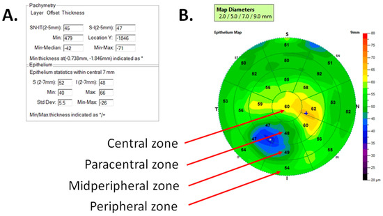 The cornea externally consists of epithelium, anterior limiting lamina (Bowman’s membrane), stroma, Dua’s layer, posterior limiting lamina (Descemet’s membrane), and endothelium [1,2,3,4,5]. In turn, the epithelium is composed uniformly of 5–7 layers of nonkeratinized stratified squamous cells and its thickness is 45 to 60 µm [1,2,3,4]. The corneal epithelium prevents the entrance of foreign bodies into the deeper layers of the cornea while allowing the transport of oxygen and nutrients [1,2,3,4]. Moreover, due to its ability to multiply quickly, it compensates for irregularities of the stroma, ensuring a smooth optical surface [1,2,3,4].