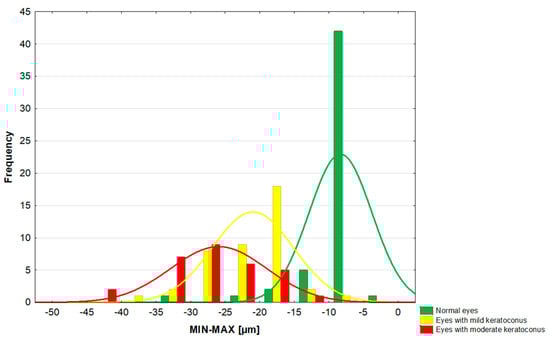 Based on the obtained MIN–MAX results, the ranges of values of this parameter were calculated. Healthy eyes and eyes with early and moderate keratoconus were −8.0 to −4.0, −13.0 to −11.0, and −43.0 to −33.0 µm, respectively. Moreover, a histogram of the MIN–MAX values in groups was produced (Figure 2). Distribution curves for groups overlap, especially for groups I and II.