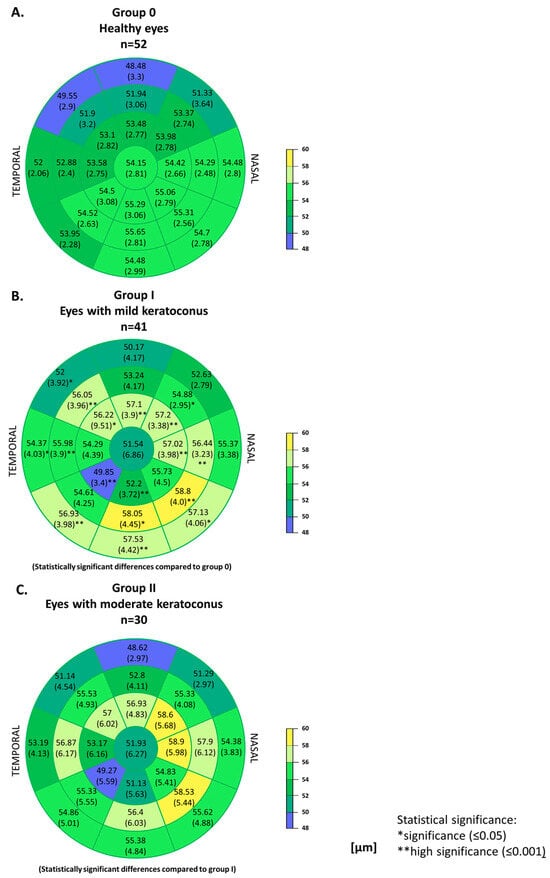 Corneal epithelial thickness maps. (A) in healthy eyes, (B) in eyes with mild keratoconus and statistical differences to healthy eyes, and (C) in eyes with moderate keratoconus and statistical differences to mild keratoconus; mean values.