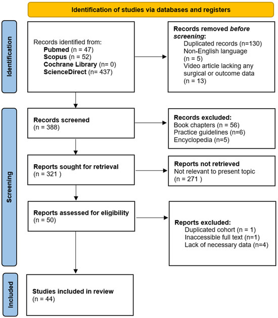 Figure 4 provides a comprehensive overview of the study selection process. The initial systematic literature search yielded 536 publications from the PubMed, Scopus, Cochrane Library, and ScienceDirect databases. After the removal of 130 duplicate records, 5 non-English records, and 13 video-only records, 388 records were screened. During the title and abstract screening, 56 book chapters, 6 practice guidelines, and 5 encyclopedias were excluded. Of the 321 reports considered for full-text review, 271 were excluded because they were irrelevant to the topic. Additionally, 6 full-text articles were removed due to inaccessibility (1), lack of necessary data (4), or duplicate cohorts (1). Ultimately, 44 studies were included in this review.