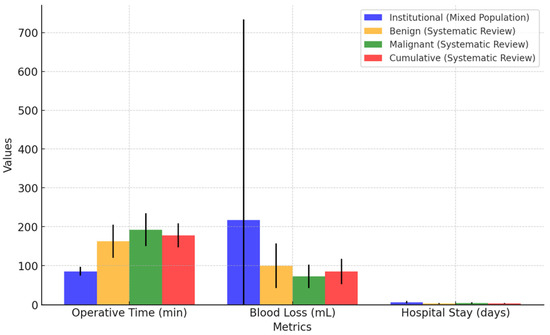 All statistical analyses were performed using Statistica 13.3 (StatSoft Inc., Tulsa, OK, USA). Data synthesis was conducted if at least five studies provided comparable data for a given outcome. Descriptive statistics were used to summarize the data. For continuous quantitative variables (e.g., hospital stay, operative time, console time, estimated blood loss, and age), we calculated arithmetic means, medians, minimum, and maximum values, along with 95% confidence intervals to present the central tendency. For any study that reported a range for continuous clinical variables, such as blood loss (mL) or operation time (min), the mid-point of the range was calculated prior to performing the descriptive analysis. For categorical qualitative variables (e.g., symptoms, imaging method used, umbilicus removal, lymphadenectomy, peri- and postoperative complications, and pathological outcomes), we reported frequencies and percentages to illustrate the distribution of these events. In cases where data were missing, we employed pairwise deletion, analyzing the available data for each specific test or summary measure. This approach was selected to maximize data retention while acknowledging any limitations in the overall sample size due to incomplete records. If missing data exceeded 20% for any outcome, sensitivity analyses were performed to evaluate the potential impact on the results. Prior to conducting the chi-square tests, assumptions were checked to ensure statistical validity. These included: (1) independence of observations, which was met by the study design; (2) adequate expected cell counts, with each cell in cross-tabulations expected to have at least five cases to maintain the reliability of the chi-square approximation; and (3) homogeneity of sample proportions across groups for comparisons. The level of statistical significance for all analyses was set at p < 0.05. All p-values were reported exactly, except when they were below the threshold of significance, in which case they were denoted as p < 0.05. Finally, we evaluated the certainty of evidence for each outcome using the GRADE approach, assessing factors such as the risk of bias, consistency, directness, precision, and publication bias to gauge confidence in the results.