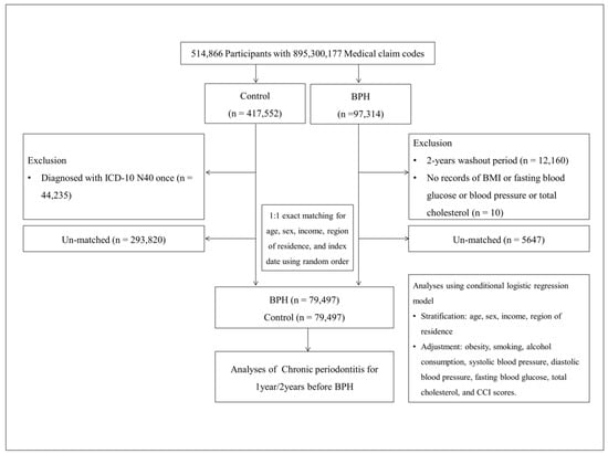 A schematic illustration of the participant selection process used in the present study. The flowchart outlines the inclusion and exclusion criteria at each step. BPH participants with a washout period of less than 2 years were excluded to ensure diagnostic accuracy, and control participants with a single BPH diagnosis were excluded to avoid potential misclassification. Participants with missing health data, including BMI, fasting blood glucose, blood pressure, or total cholesterol, were also removed. During the matching process, participants were excluded if they could not be matched due to demographic or clinical differences. Ultimately, of a total of 514,866 participants, 79,497 participants with BPH were matched with 79,497 control participants based on age, sex, income, and region of residence.