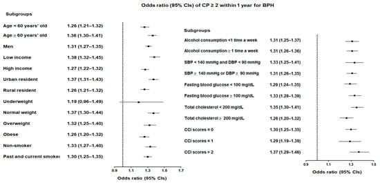 Participants with CP ≥ 1 within 1 year were significantly more likely to have BPH, with an OR of 1.34 (95% CI = 1.31–1.37, p < 0.001; Table 2). This means that individuals with at least one CP diagnosis within a year had a 34% higher likelihood of being diagnosed with BPH compared to those without CP during the same period. This association was consistent across all subgroups, including age, income, residential region, and health-related variables. Among these subgroups, the low-income group showed the highest odds of BPH (OR = 1.43, 95% CI = 1.38–1.48, p < 0.001), indicating a 43% higher likelihood of BPH among low-income individuals with CP compared to those without CP.