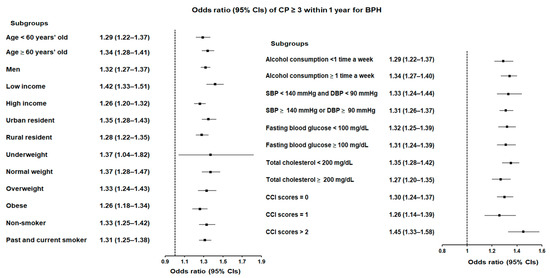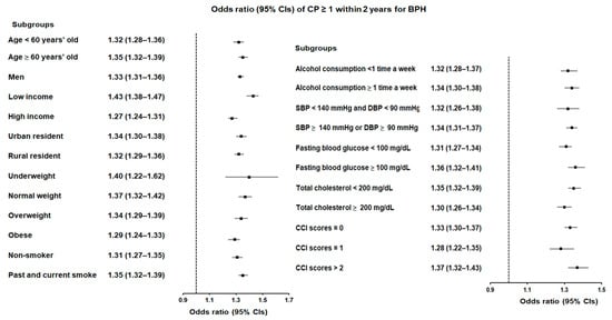 Secondary analyses were performed by stratifying participants based on adjusted factors, including age, income, residential area, smoking status, alcohol use, obesity, blood pressure, fasting blood glucose, total cholesterol, and CCI. These stratifications allowed us to evaluate whether the association between CP and BPH differed across subgroups with varying demographic, socioeconomic, lifestyle, and health characteristics.
