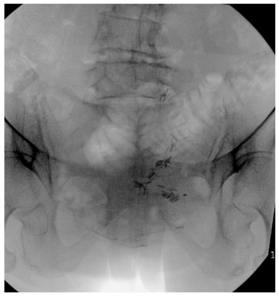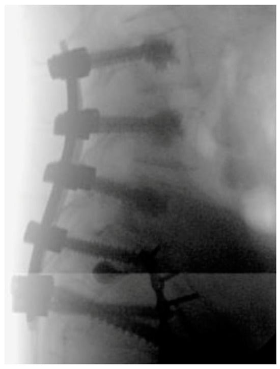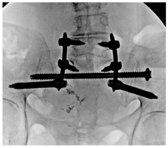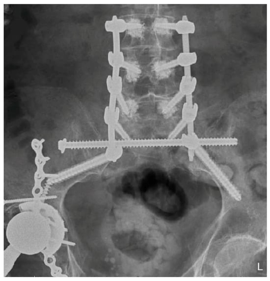 MIS techniques, when integrated with advanced technologies, provide additional benefits that are especially valuable in complex and challenging cases. Intraoperative navigation proves indispensable for maneuvering around previously placed hardware, such as acetabular screws (Figure 2 and Figure 4), broken hardware (Figure 10), or trans-sacral screws (Figure 2, Figure 3 and Figure 10). Studies, including those by Shillingford et al., have shown that S2AI screw placement using robotic or navigated freehand techniques achieves comparable outcomes when performed by experienced surgeons []. Robotic systems enhance preoperative planning and provide exceptional precision, particularly in cases involving deformity or altered anatomy, and they may improve outcomes for less experienced surgeons []. However, robotic technology has limitations, such as constraints on screw depth, which can reduce distal accuracy. There are also complications associated with the learning curve in MIS spine surgery, with an 11% complication rate, including durotomy, implant malposition, neural injury, and nonunion []. MIS techniques may also be impractical for significantly displaced, unstable fractures that require open reduction or for cases involving neurological compromise that necessitate open decompression. Finally, navigation technology and robotics increase initial surgical costs, which may not be feasible for certain hospital systems []. However, long-term costs for MIS techniques may be lower due to decreased revision rate and infection compared to open techniques []. Although MIS techniques offer significant short-term benefits in spinopelvic dissociation, their long-term outcomes for this fracture pattern remain poorly defined. However, in spine surgery for other pathologies, such as degenerative disease, MIS techniques have demonstrated comparable results to traditional open approaches [].